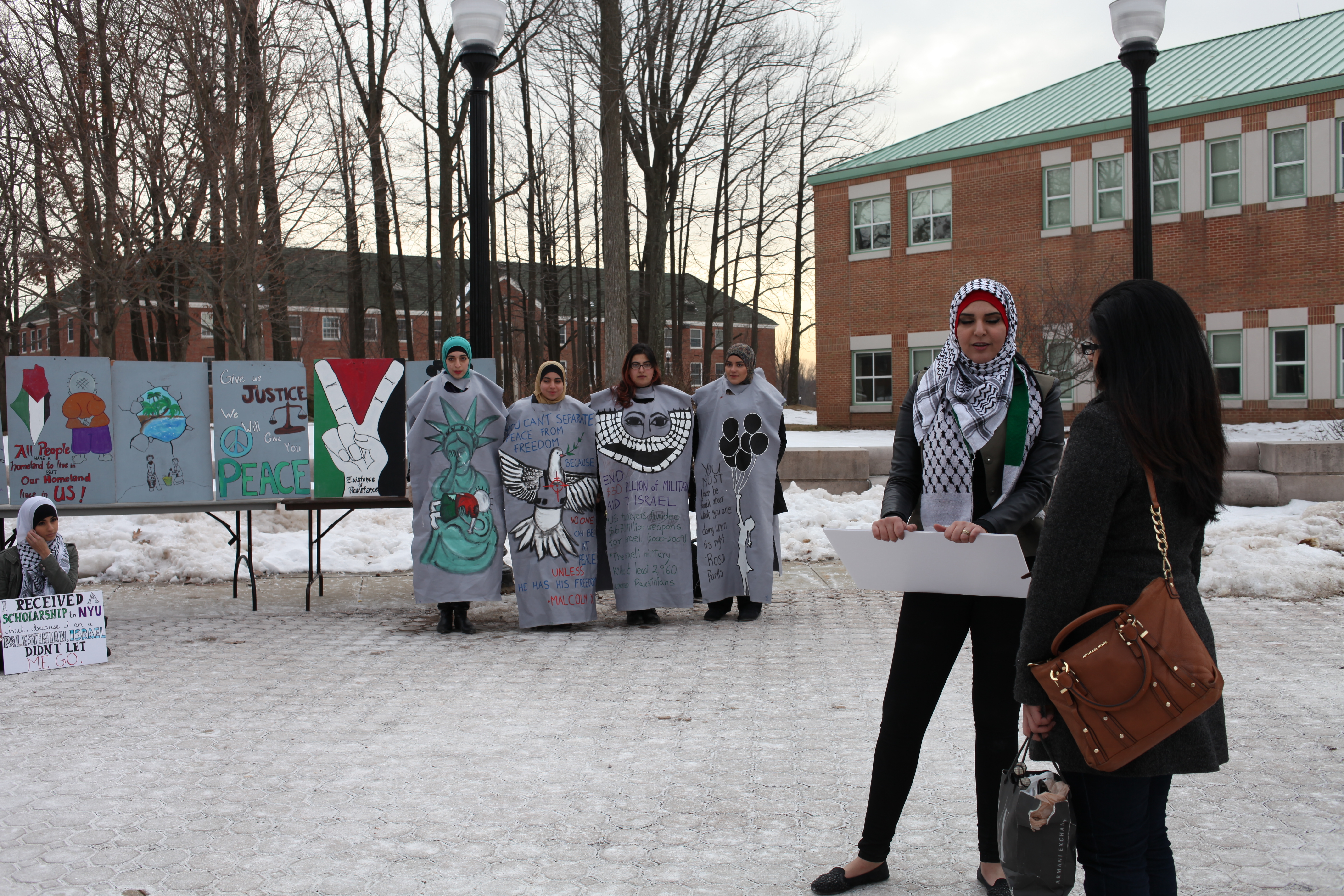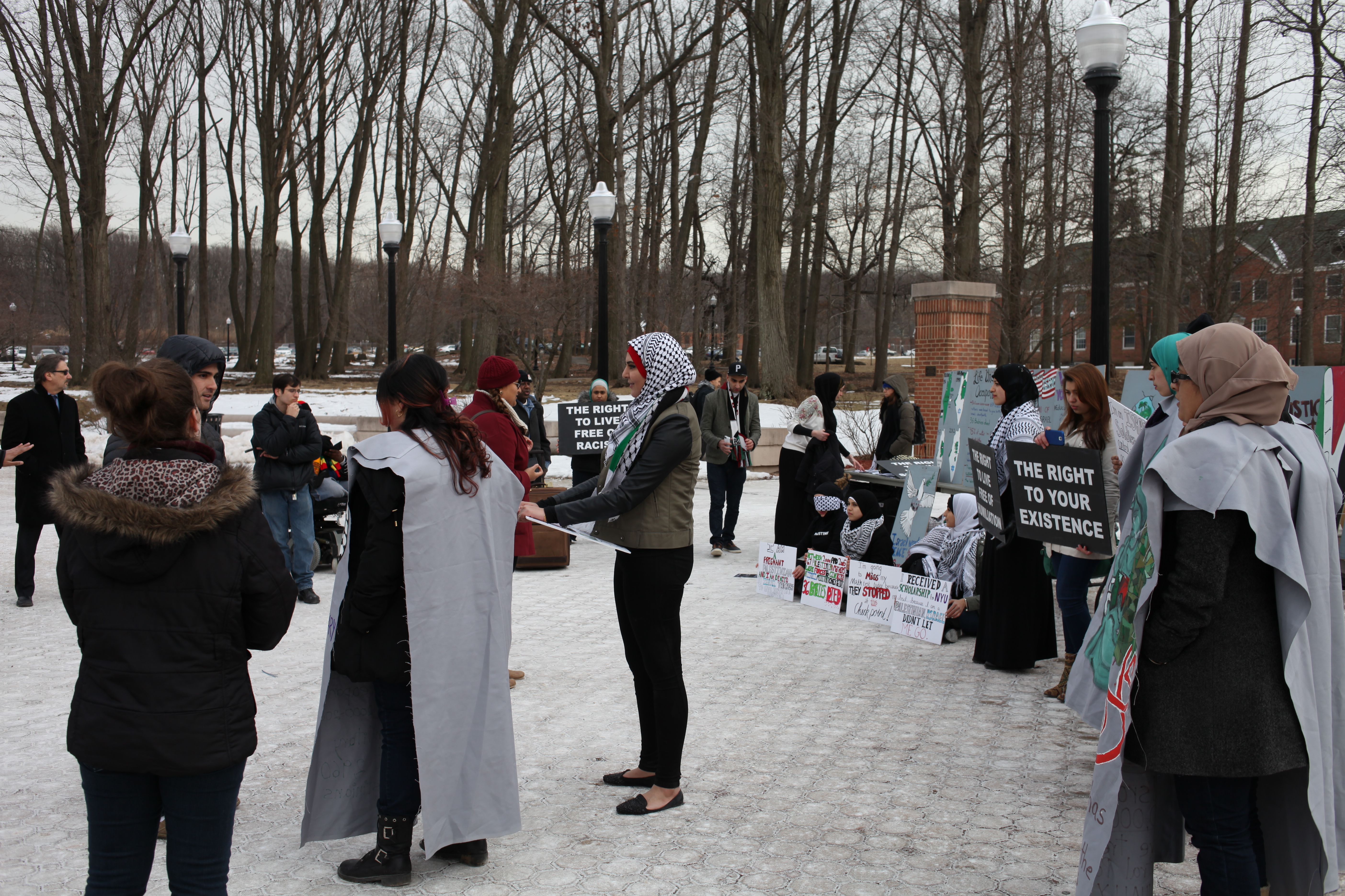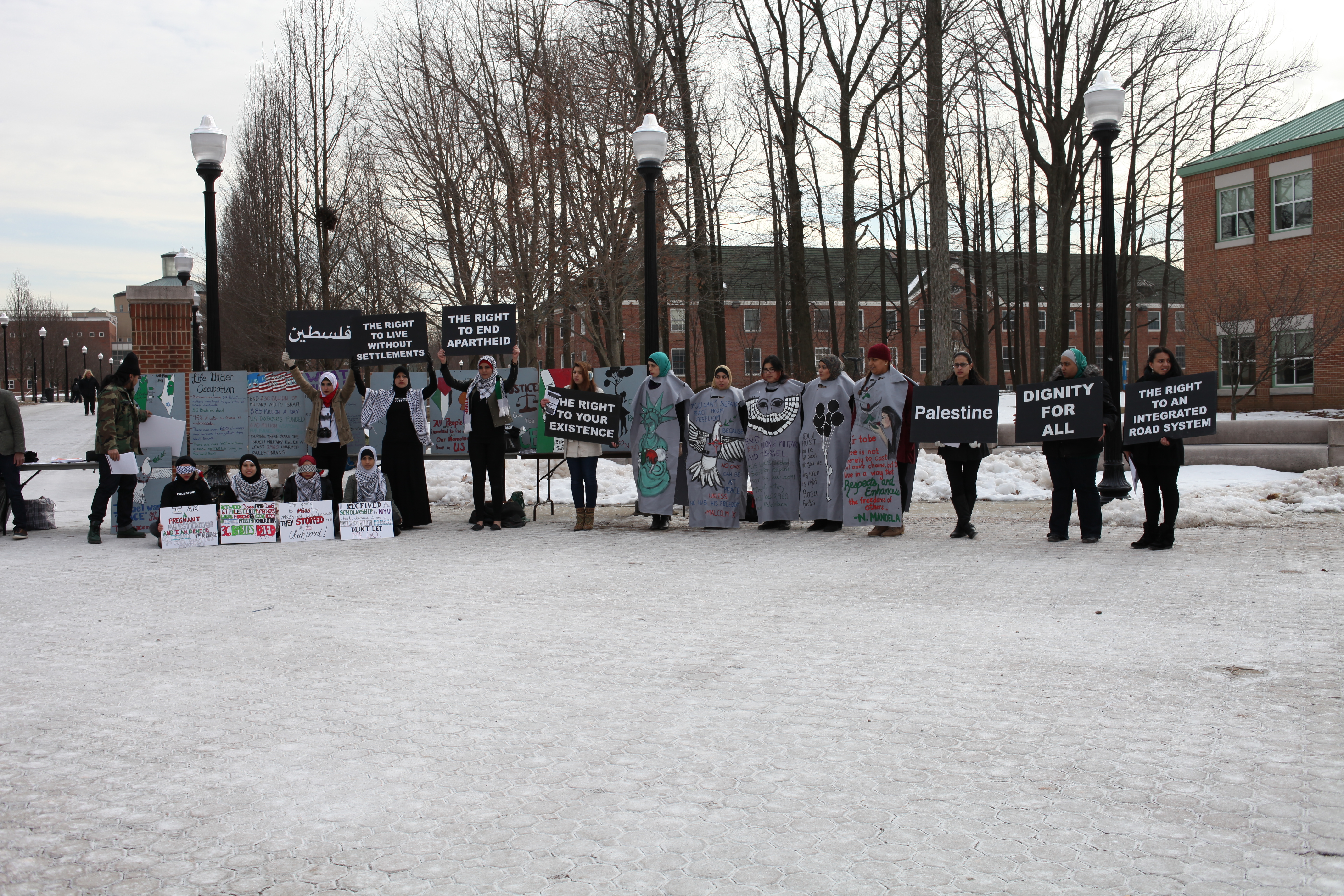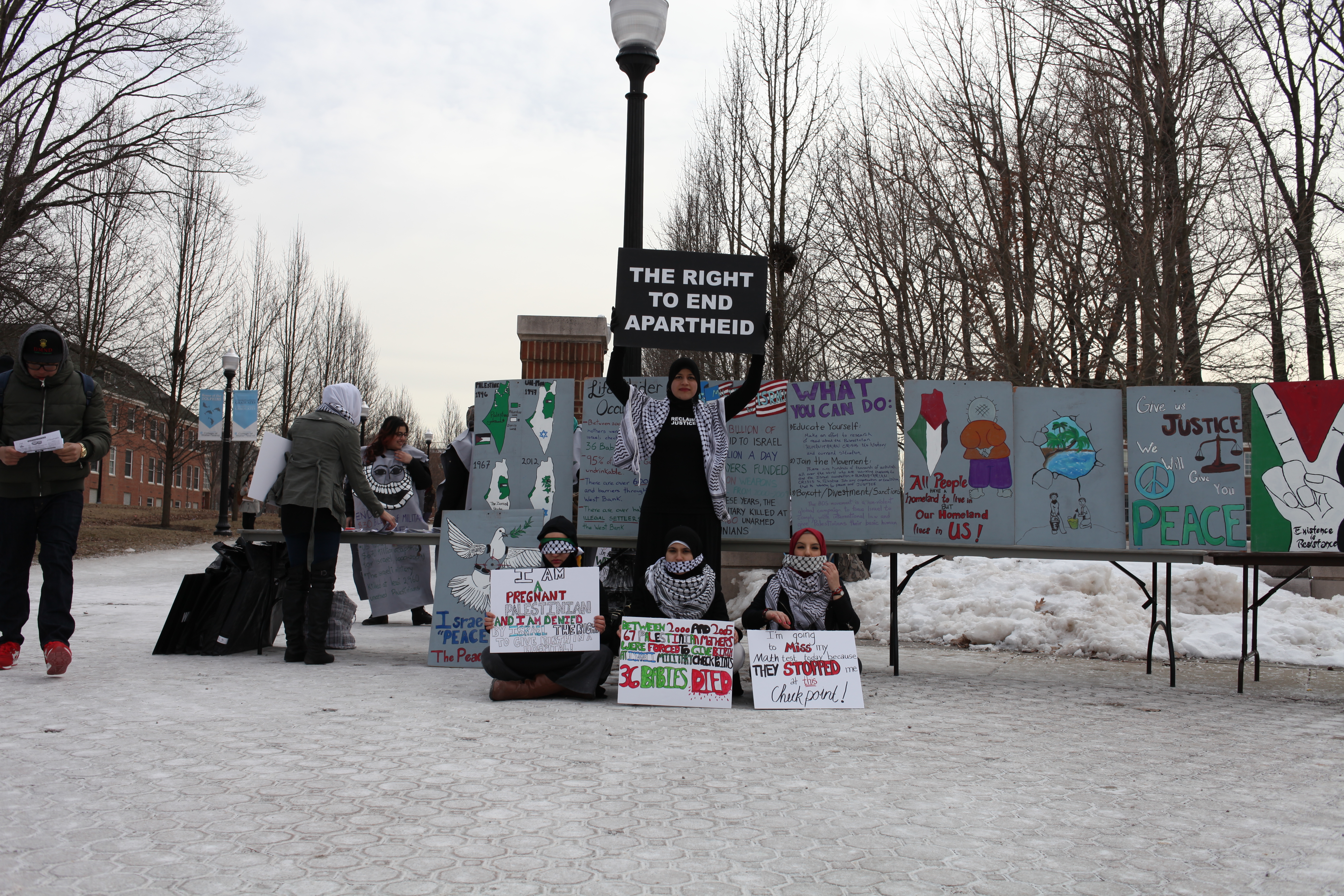 Student demonstrators set up near the fountain.